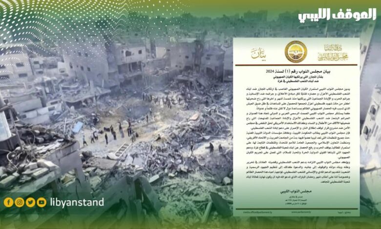 وطالب مجلس النواب الحكومة الليبية، وكافة مؤسسات الدولة الليبية المعنية حث جميع المنظمات التي تعد ليبيا عضوا فيها، بدءً من الجامعة العربية، والاتحاد الأفريقي ومنظمة التعاون الإسلامي، والجمعية العامة للأمم المتحدة، والمنظمات التابعة لها، على استمرار المطالبة بوقف الحرب و رفع الحصار عن أبناء شعبنا الفلسطيني في قطاع غزة، ودعم الجهود التي تتبناها القوى الدولية الحرة والمحبة للسلام، التي تعمل على تجريم الكيان الصهيوني.