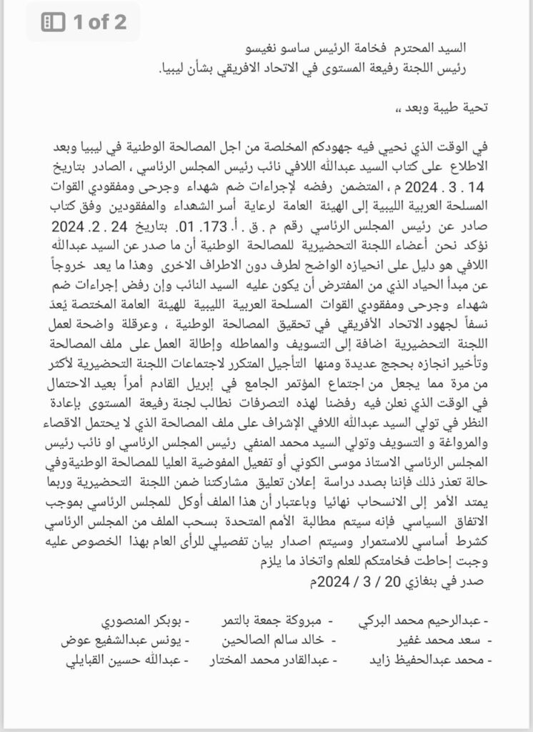 وأعلن الوفد في رسالته إلى الرئيس ساسو نغيسو رئيس اللجنة رفيعة المستوى في الاتحاد الأفريقي، رفضه لهذه في التصرفات، مطالبا بتشكيل لجنة رفيعة المستوى لإعادة النظر في تولي عبد الله اللافي الإشراف على ملف المصالحة الذي لا يحتمل الإقصاء والمرواغة والتسويف وتولي محمد المنفي رئيس المجلس الرئاسي أو نائب رئيس المجلس الرئاسي موسى الكوني أو تفعيل المفوضية العليا للمصالحة الوطنية.