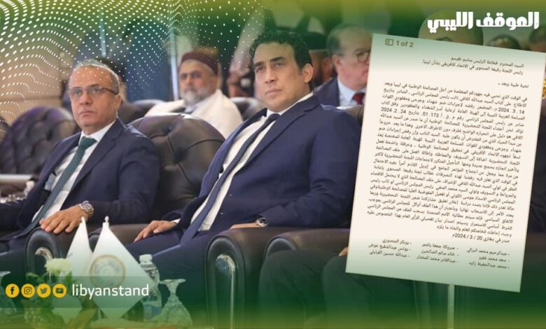 وجاء في الخطاب: “في الوقت الذي نحيي فيه جهودكم المخلصة من أجل المصالحة الوطنية في ليبيا وبعد الإطلاع على كتاب عبد الله اللافي نائب رئيس المجلس الرئاسي، الصادر بتاريخ 14 مارس 2024، المتضمن رفضه لإجراءات ضم شهداء وجرحى ومفقودي القوات المسلحة العربية الليبية إلى الهيئة العامة لرعاية أسر الشهداء والمفقودين وفق كتاب صادر عن رئيس المجلس الرئاسي بتاريخ 24 فبراير 2024”.