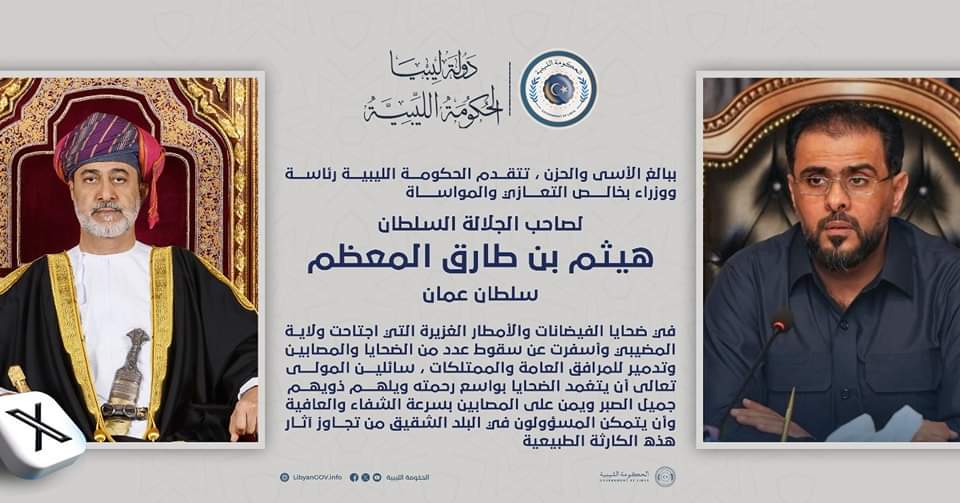 تقدم رئيس الحكومة المكلفة من مجلس النواب أسامة حماد بالعزاء إلى سلطان عمان هيثم بن طارق في ضحايا الفيضانات والأمطار لتي اجتاحت ولاية المضيبي.