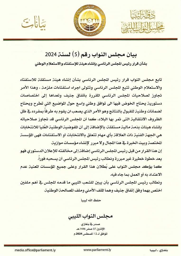 أصدر مجلس النواب الليبي بيانا رقم (5) لسنة 2024، بشأن قرار رئيس المجلس الرئاسي بإنشاء هيئة للإستفتاء والاستعلام الوطني