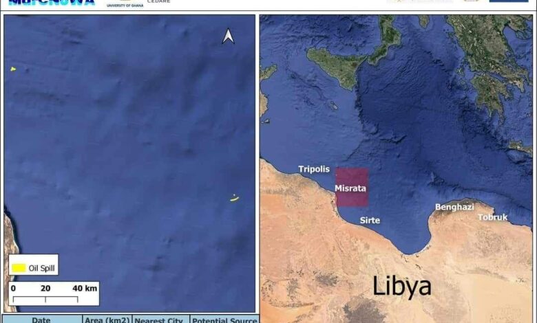 أعلن المركز الليبي للاستشعار عن بعد وعلوم الفضاء عن رصد تلوثا بحريا قبالة ساحل مصراتة نتيجة تسرب نفطي.