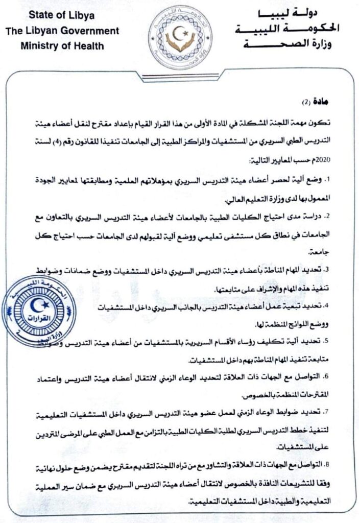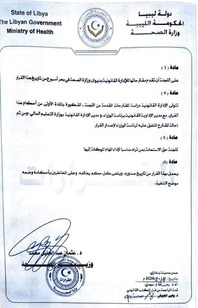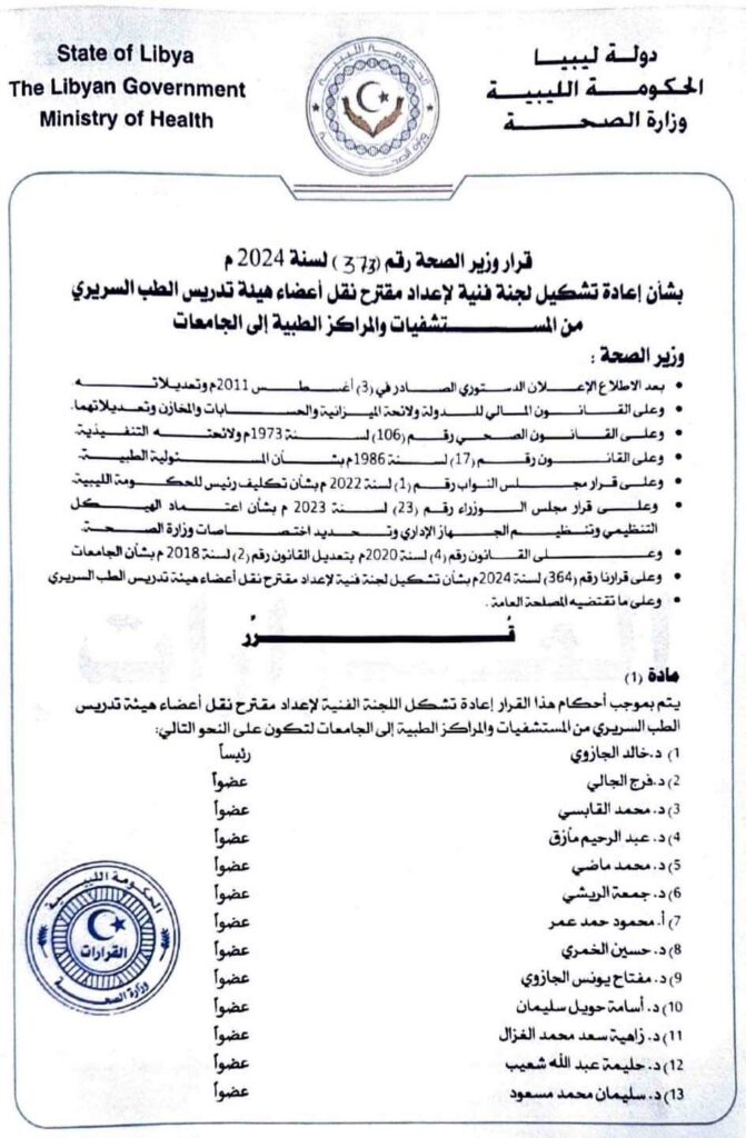 أمر وزير الصحة قرارًا رقم (373) لسنة 2024 بإعادة تشكيل لجنة فنية لإعداد مقترح بنقل أعضاء هيئة التدريس الطبي السريري من المستشفيات والمراكز الطبية إلى الجامعات.