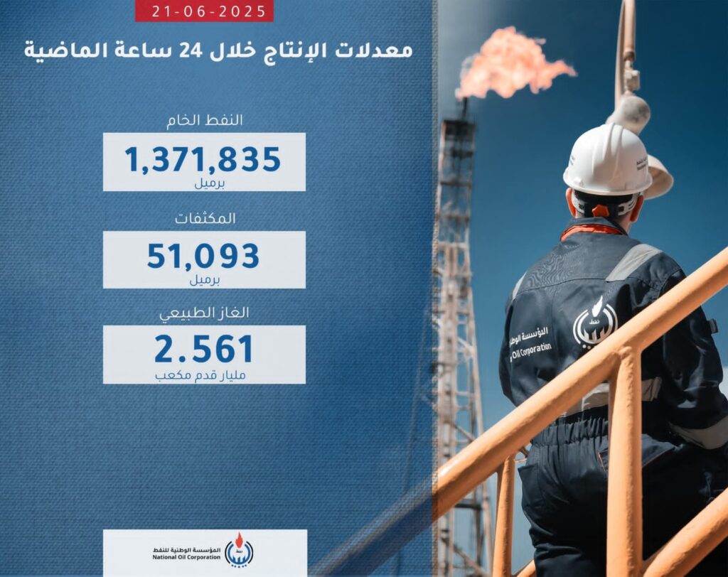 كشفت المؤسسة الوطنية للنفط عن معدلات الإنتاج النفطي خلال الأربع والعشرين ساعة الماضية، حيث بلغ إنتاج النفط الخام 1,371,835 برميلًا، فيما سجل إنتاج المكثفات 51,093 برميلًا.