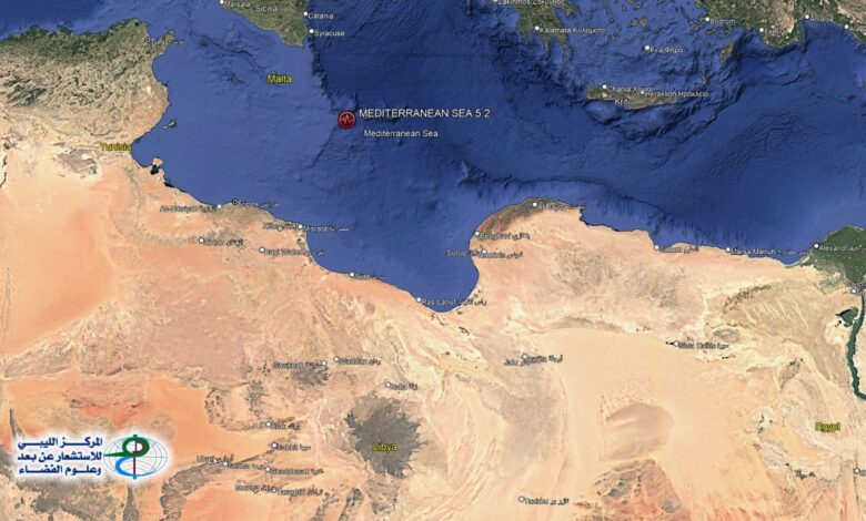 أعلن المركز الليبي للاستشعار عن بعد وعلوم الفضاء أن محطات الرصد العالمية سجلت صباح اليوم الاثنين عند الساعة 11:55 بالتوقيت المحلي، هزة أرضية بقوة 5.2 درجة على مقياس ريختر، كان مركزها في وسط البحر الأبيض المتوسط على عمق 10 كيلومترات.