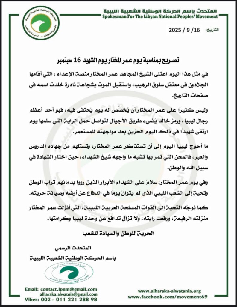 وأكدت الحركة في بيان لها أن تخصيص يوم للشهيد هو وفاءٌ لرجلٍ جسّد معاني التضحية والفداء، وأصبح رمزًا خالدًا للأمة الليبية، مشيرةً إلى أن الأجيال ستظل تستلهم من سيرته دروس العزة والكرامة.