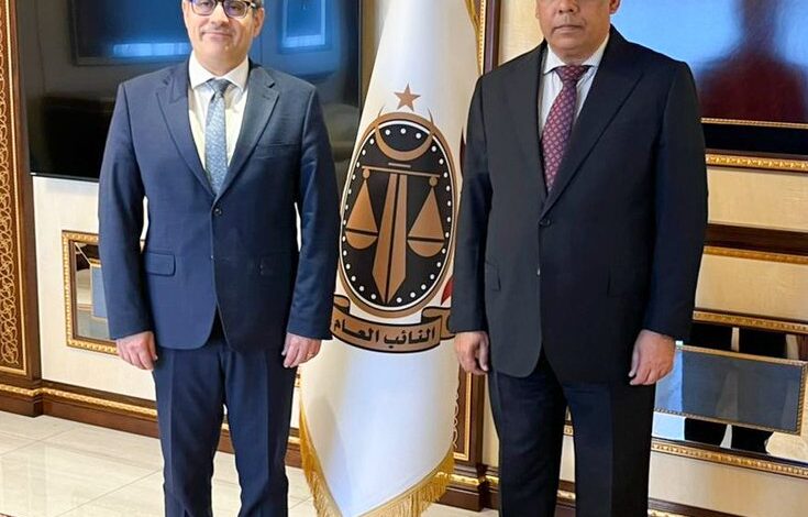استعرض النائب العام المستشار الصديق الصور جهود رفع كفاءة مؤسسات إنفاذ القانون في ليبيا مع القائم بأعمال السفارة الأميركية لدى ليبيا جيريمي برنت.