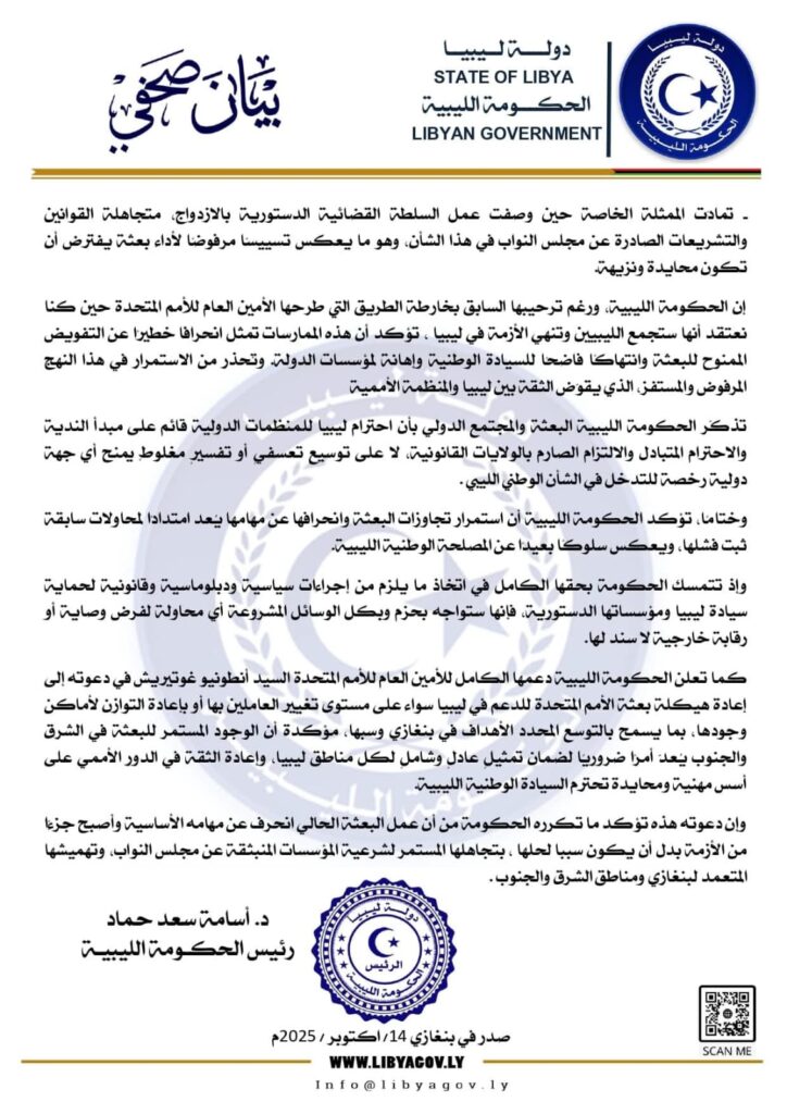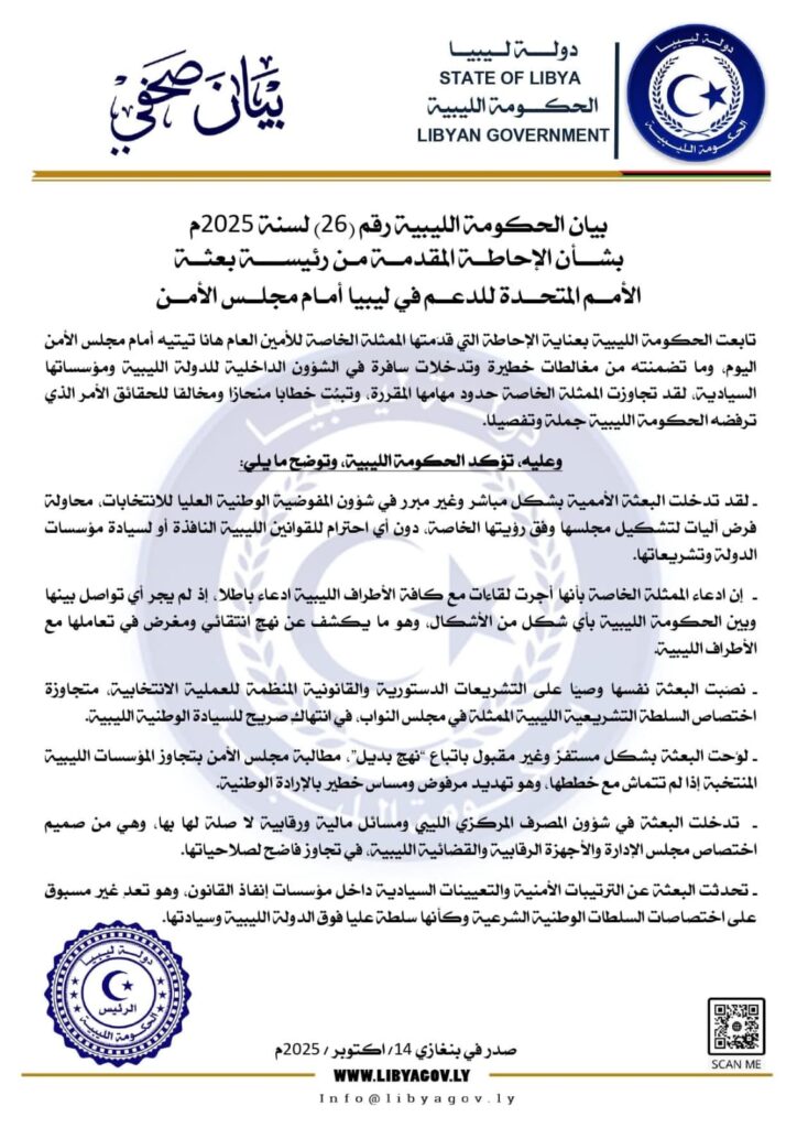 أصدرت الحكومة بيانًا رسميًا حمل رقم (26) لسنة 2025 بشأن الإحاطة التي قدّمتها الممثلة الخاصة للأمين العام للأمم المتحدة للدعم في ليبيا، هانا تيتة، أمام مجلس الأمن.